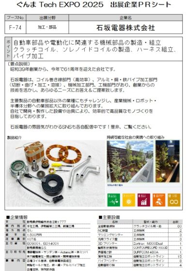 石坂電器のブースは『加工・部品』エリア F-74 となります 。
